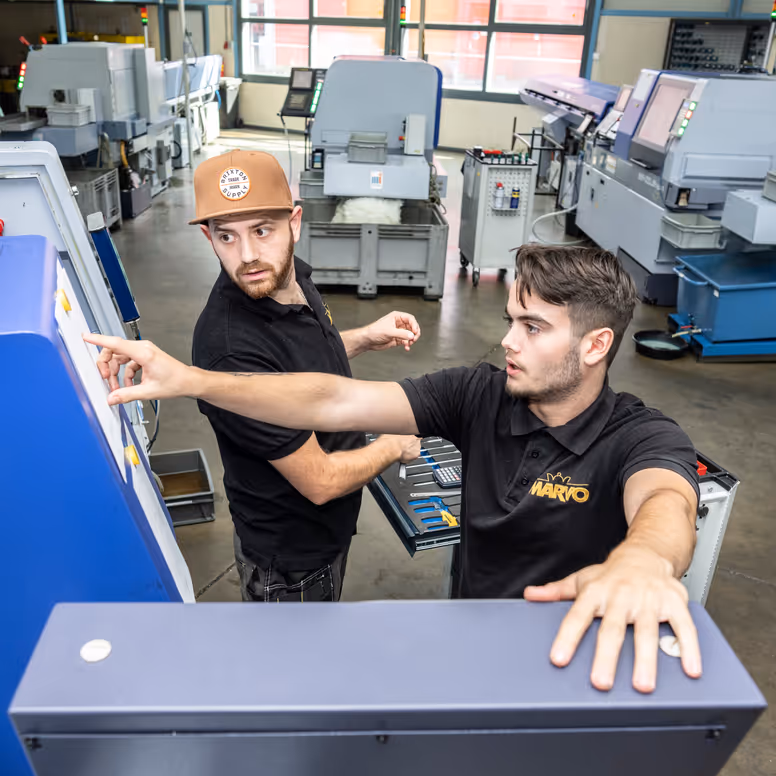 Bij Marvo draait alles om specialistisch CNC-draaiwerk: het verspanen van metaal en kunststof. En wie bij Marvo binnenkomt, doet dat om te leren. “We hebben daarom de mensen op de vloer ook ingedeeld in vier niveaus: leerling, aankomend, vakvolwassen en specialist,” vertelt Nellie. “Zodat uiteindelijk iedereen specialist wordt.”